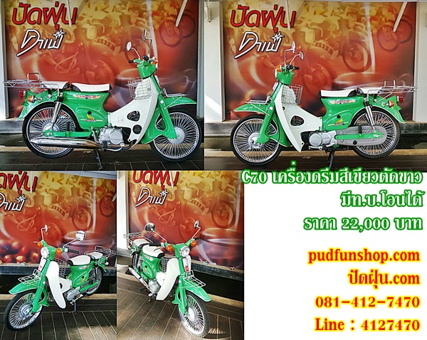 C70 เครื่องดรีมสีเขียวตองตัดขาว ระบบ4เกียร์+มีท.บ.โอนได้ ราคา 22,000 บาท